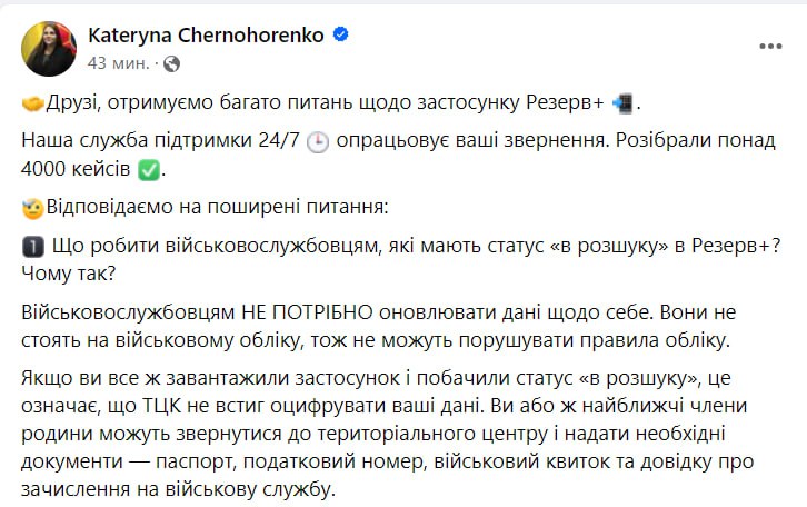 "Если вы... увидели статус "В розыске", это означает, что ТЦК не успел оцифровать ваши данные. Вы или ближайшие члены семьи могут обратиться в территориальный центр и предоставить необходимые документы: паспорт, налоговый номер, военный билет и справку о зачислении на военную службу", – написала она.