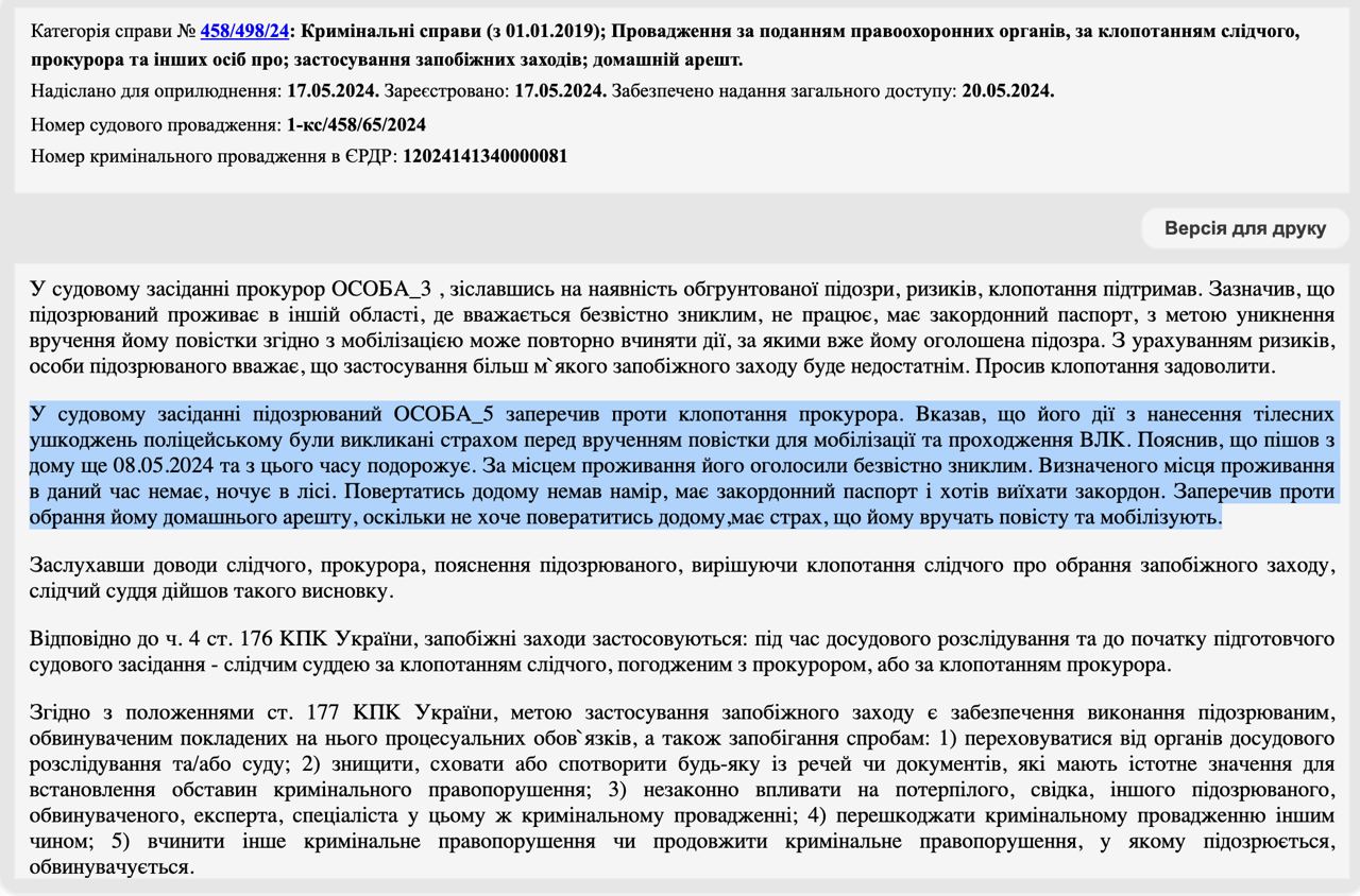 Утром 16 мая в городе Турка в Самборском районе его остановил полицейский. По словам мужчины, он "испугался", что ему вручат повестку, поэтому трижды ударил копа кулаком по лицу и попытался убежать. Полицейский догнал его возле автомобиля и получил еще несколько ударов ногами по телу.