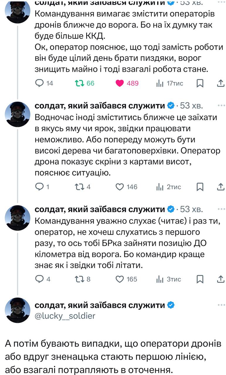 Согласно рассказу одного из военных, командование считает, что операторов дронов нужно размещать ближе к противнику: там, по его мнению, от них больше пользы. При этом операторы пытаются объяснить, что работа на "нуле" угрожает уничтожением всего оборудования или создает ситуацию, когда управление дронами невозможно.