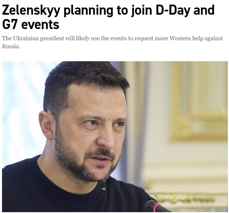 21:44 Зеленский намерен посетить мероприятия в Нормандии в честь 80-летия высадки союзных войск и встречу G7 в Италии, чтобы просить у Запада еще больше оружия, а также «попросить НАТО сбивать российские ракеты».