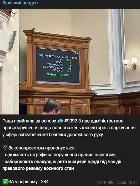 Рада приняла в первом чтении законопроект, запрещающий эвакуацию авто во время военного положения
