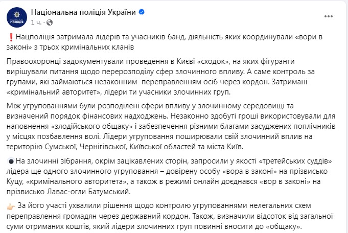 Правоохранители задокументировали проведение в столице нескольких "сходок" трех криминальных кланов, на которых распределяли сферы влияния и финансы, поступившие на территории Киева, Сумской, Черниговской, Киевской областей от помощи в нелегальном выезде из Украины.