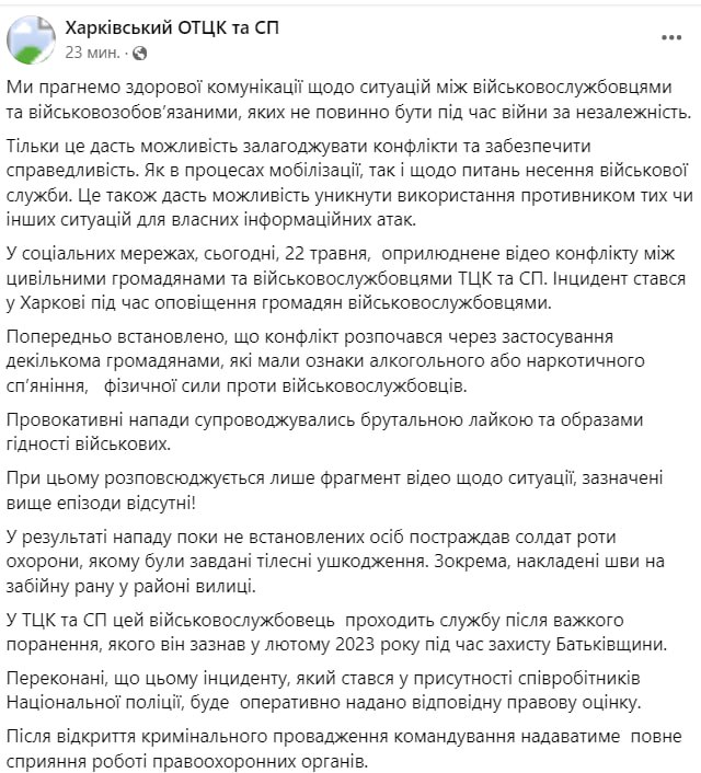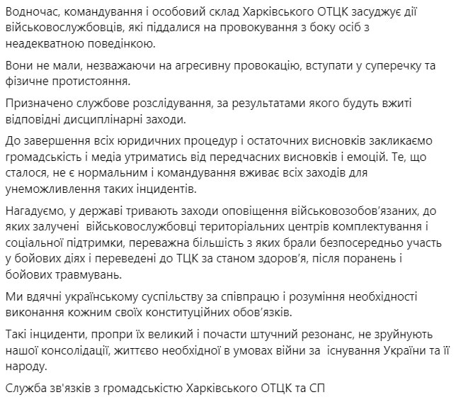 Харьковский областной ТЦК подтвердил участие своих сотрудников в избиении гражданских лиц и обвинил самих гражданских в провокации.