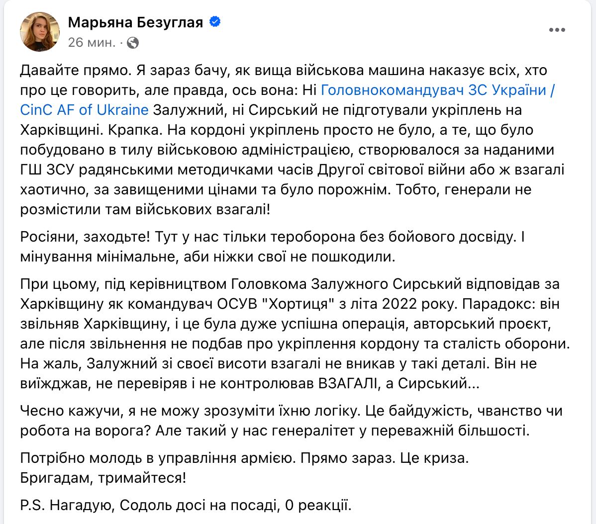 "Ни главком Залужный, ни Сырский не подготовили укреплений на Харьковщине. На границе укреплений просто не было, а то, что было построено в тылу военной администрацией, создавалось по предоставленным Генштабом ВСУ советским методикам времен Второй мировой войны или вообще хаотично, по завышенным ценам, и было пустым. То есть генералы не разместили там военных вообще!" - написала Безуглая.