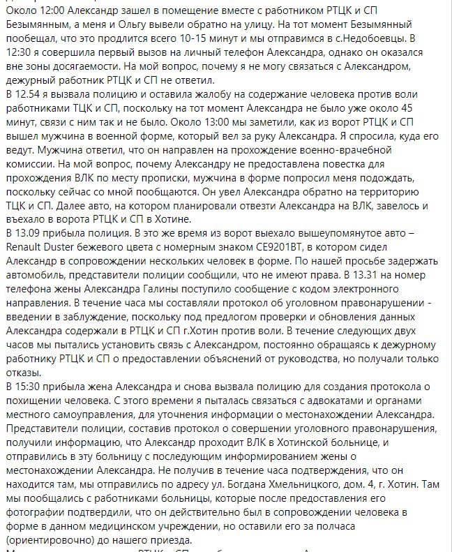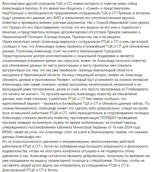 Через несколько минут Александр вернулся с сотрудником РТЦК и СП к нам, где второй сообщил о том, что Александру нужно проехать в ближайший ТЦК и СП для обновления данных. Поскольку Александр стоит на учете в Хмельницком городском ТЦК и является ограниченно годным в военное время, мы спросили, может ли Александр получить повестку для обновления данных по месту регистрации и месту приписки. Нам отказали, аргументируя это тем, что мы уже переехали границы Хмельницкой области и находимся в Черновицкой области.
