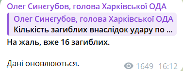 Об этом сообщил глава Харьковской ОВА Олег Синегубов.