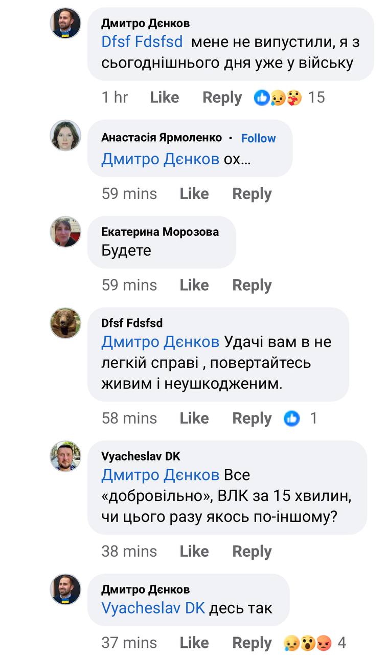 На вопрос в комментариях в Фейсбуке, отправили ли его служить "добровольно" и с "ВВК за 15 минут", Денков ответил: "где-то так".