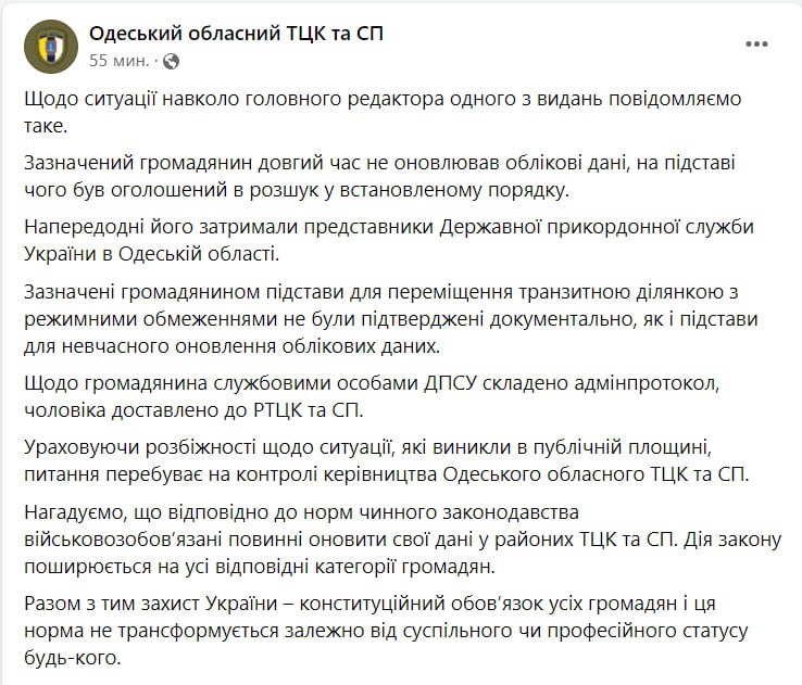 Тем временем комментарий по инциденту опубликовал Одесский областной ТЦК.