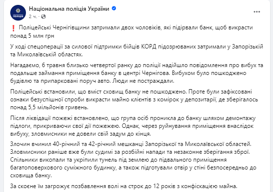 Задержаны подозреваемые в подрыве банка в центре Чернигова с целью ограбления в начале мая. Они планировали украсть более 5,5 млн гривен с ячеек в депозитарии.