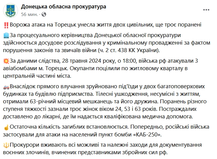 Об этом сообщает Донецкая областная прокуратура на своей странице в Фейсбуке.