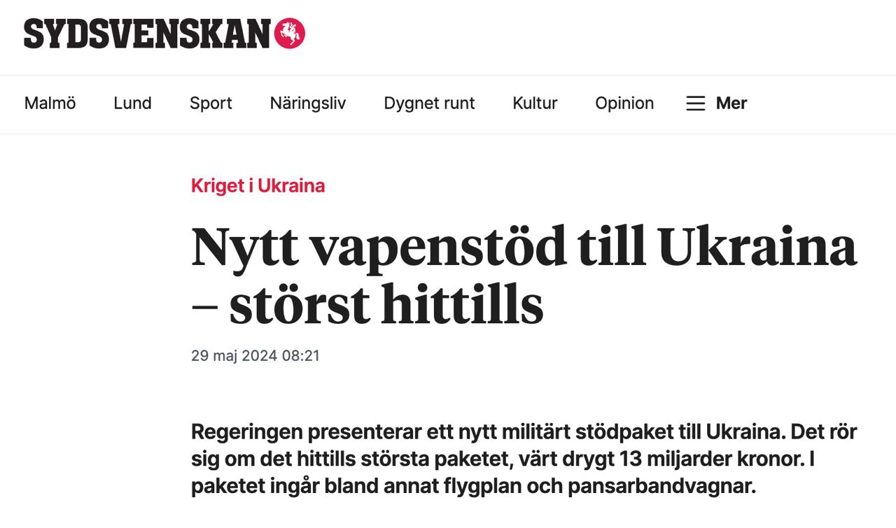 Швеция передала Украине авиацию и бронетранспортеры в рамках крупнейшего военного пакета помощи на 1,3 млрд долларов.