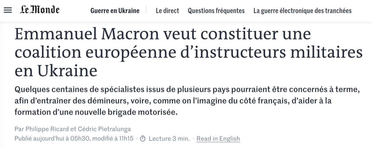 Президент Франции Эммануэль Макрон хочет сформировать европейскую коалицию военных инструкторов, работающих непосредственно в Украине.