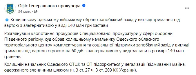 "Рассмотрев ходатайство прокуроров Специализированной прокуратуры в сфере обороны Южного региона, суд избрал бывшему начальнику Одесского областного территориального центра комплектования и социальной поддержки меру пресечения в виде содержания под стражей сроком на 60 суток с альтернативой в виде залога в размере 140 миллионов гривен. Бывший начальник Одесского ОТЦК и СП подозревается в легализации (отмывании) имущества, полученного преступным путем (ч. 3 ст. 27 ч. 3 ст. 209 УК Украины)", - сказано в публикации.