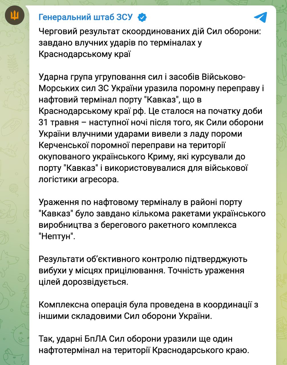 Генштаб ВСУ заявил, что в Краснодарском крае РФ украинскими ракетами "Нептун" были поражены паромная переправа и нефтяной терминал порта "Кавказ".