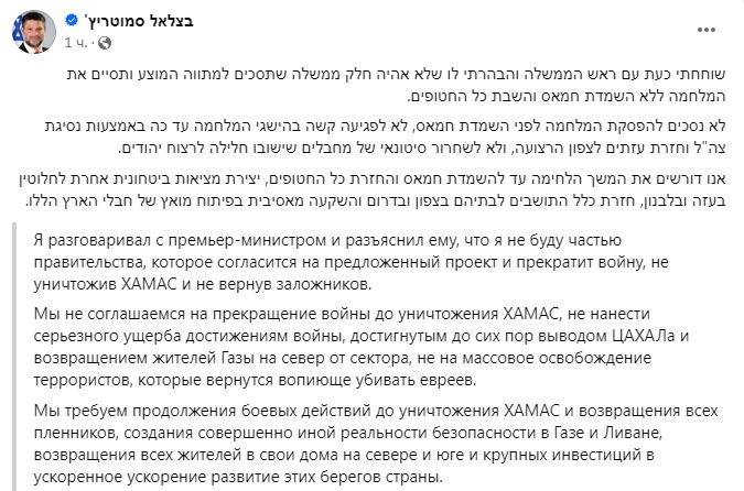 Так, министр национальной безопасности Итамар Бен-Гвир написал, что его партия "Оцма Йехудит" в случае принятия предложения "распустит правительство".