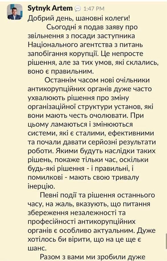 Паблики публикуют его сообщение, судя по всему, из закрытого рабочего чата, где Сытник пишет, что подал заявление об отставке из-за изменений в деятельности антикоррупционных органов.