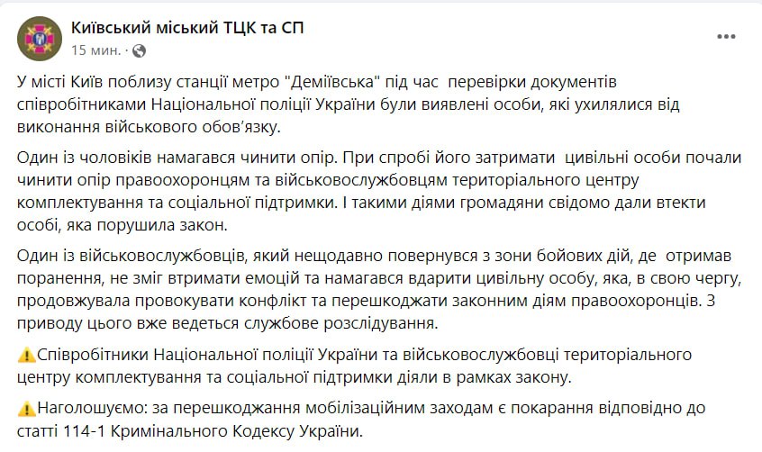 В сообщении ТЦК в Фейсбуке говорится, что возле станции метро "Демеевская" во время проверки документов сотрудники полиции обнаружили "уклоняющихся от исполнения воинского долга лиц". Как заявляет ТЦК, один из мужчин начал сопротивляться, а при попытке его задержать противодействовать правоохранителям и военкомам начали уже гражданские лица, в результате чего мужчина смог сбежать.