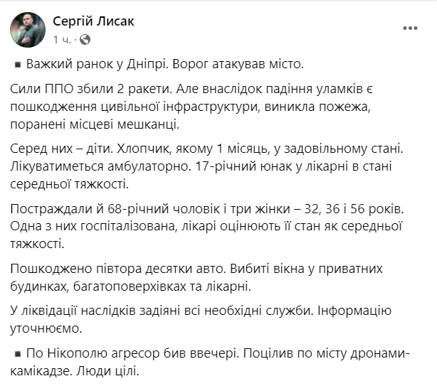 Позже стало известно еще об одном раненом в Днепре. Это 37-летний мужчина, он в больнице.