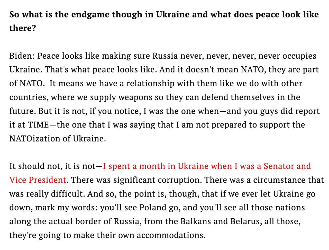 "Украина никогда не должна быть оккупированной Россией. И это не означает, что она (Украина - Ред.) становится частью НАТО. Это означает, что у нас с ними такие же отношения, как и с другими странами, когда мы поставляем им оружие, чтобы они могли защитить себя в будущем. Но я был тем, кто говорил, что не готов поддержать натовизацию Украины", - сказал Байден.