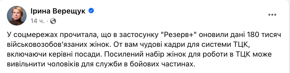 "В соцсетях прочитала, что в приложении "Резерв+" обновили данные 180 тысяч военнообязанных женщин. Вот вам отличные кадры для системы ТЦК, включая руководящие должности. Усиленный набор женщин для работы в ТЦК может высвободить мужчин для службы в боевых частях", – написала Верещук.