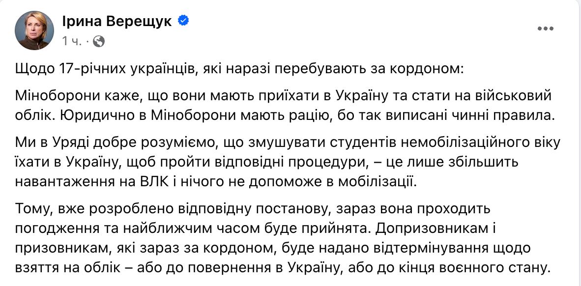 "Мы в правительстве хорошо понимаем, что заставлять студентов немобилизационного возраста ехать в Украину, чтобы пройти соответствующие процедуры, – это лишь увеличит нагрузку на ВВК и ничем не поможет в мобилизации", – сказано в публикации Верещук.
