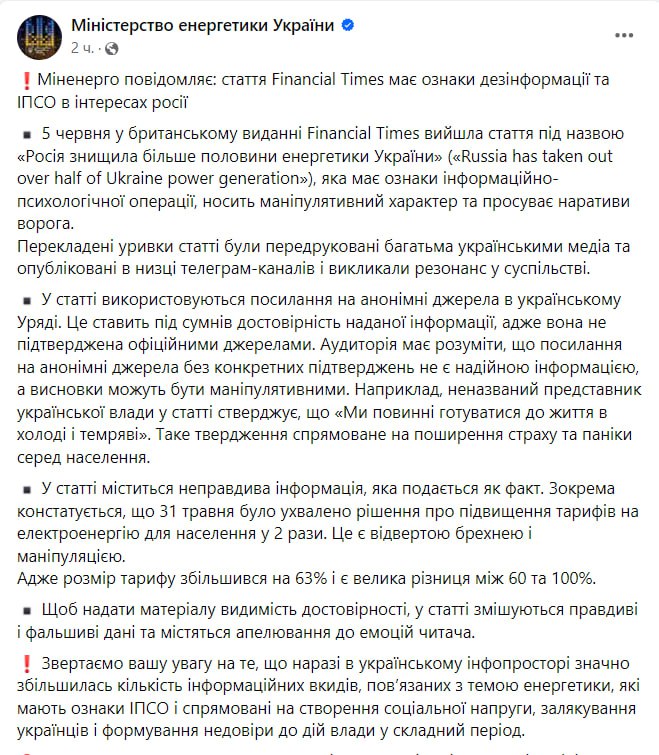 Минэнерго сообщает, что статья Financial Times под названием "Россия уничтожила более половины энергетики Украины" "имеет признаки информационно-психологической операции (ИПСО), носит манипулятивный характер и продвигает нарративы врага".