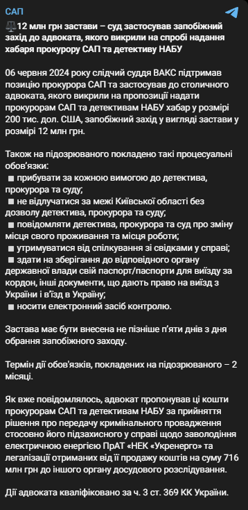 ВАКС избрал адвокату из компании Маси Найема меру пресечения по делу о взятке - 12 миллионов гривен залога