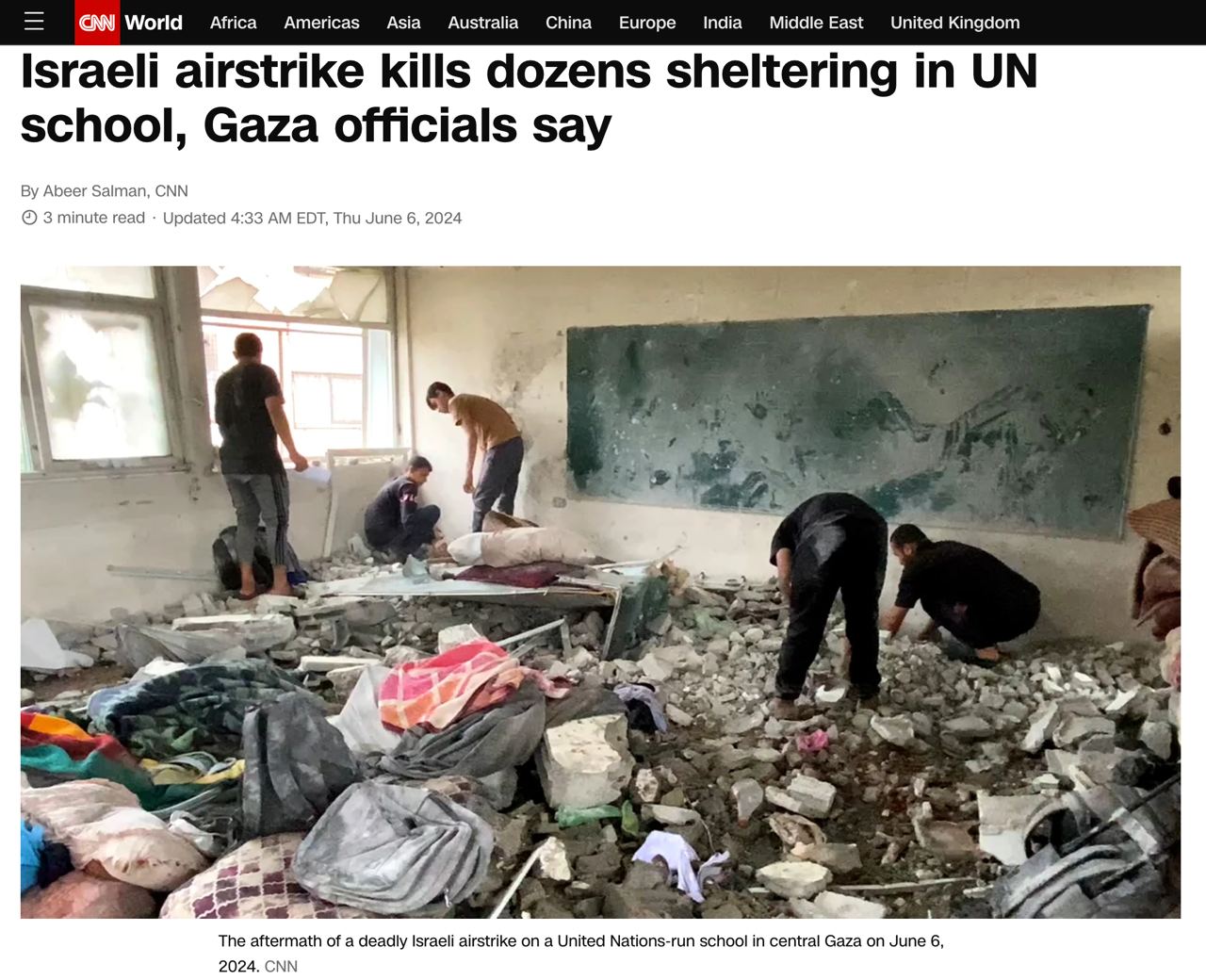 В ночь на 6 июня Израиль нанес удар по школе в секторе Газа, находящейся в ведении ООН, где укрывались беженцы. Власти Палестины заявляют о 45 погибших.