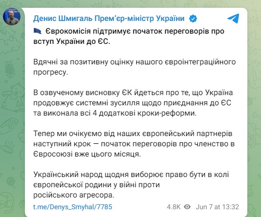 "Еврокомиссия поддерживает начало переговоров по вступлению Украины в ЕС. Благодарны за положительную оценку нашего евроинтеграционного прогресса. В озвученном заключении ЕК говорится, что Украина продолжает системные усилия по присоединению к ЕС и выполнила все 4 дополнительных шага-реформы. Теперь мы ожидаем от наших европейских партнеров следующий шаг – начало переговоров о членстве в Евросоюзе уже в этом месяце", - написал Шмыгаль.