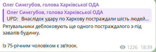 18:45 В Харькове из-под завалов частного дома, разрушенного авиабомбой, пытаются освободить 75-летнего мужчину, сообщил глава ОВА Синегубов.