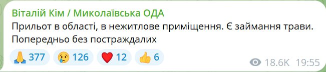 20:05 Прилет в Николаевской области, сообщает глава региона Ким.