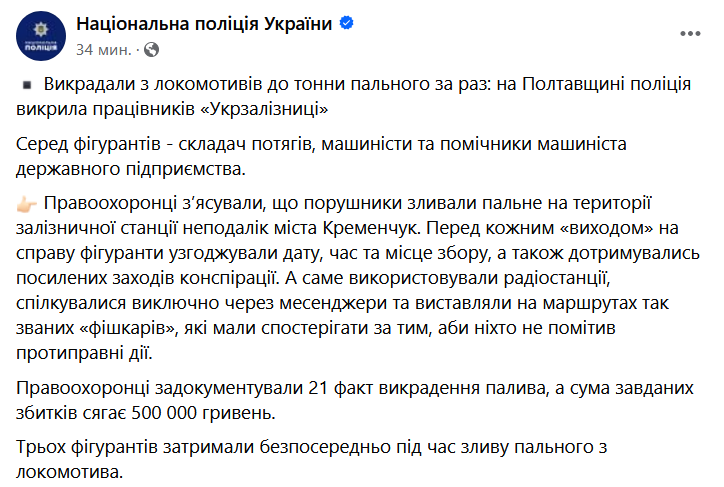 По данным правоохранителей, злоумышленники воровали из локомотивов до тонны топлива за раз на железнодорожной станции около Кременчуга. Задокументирован 21 такой эпизод, а задержали их прямо во время очередного слива.