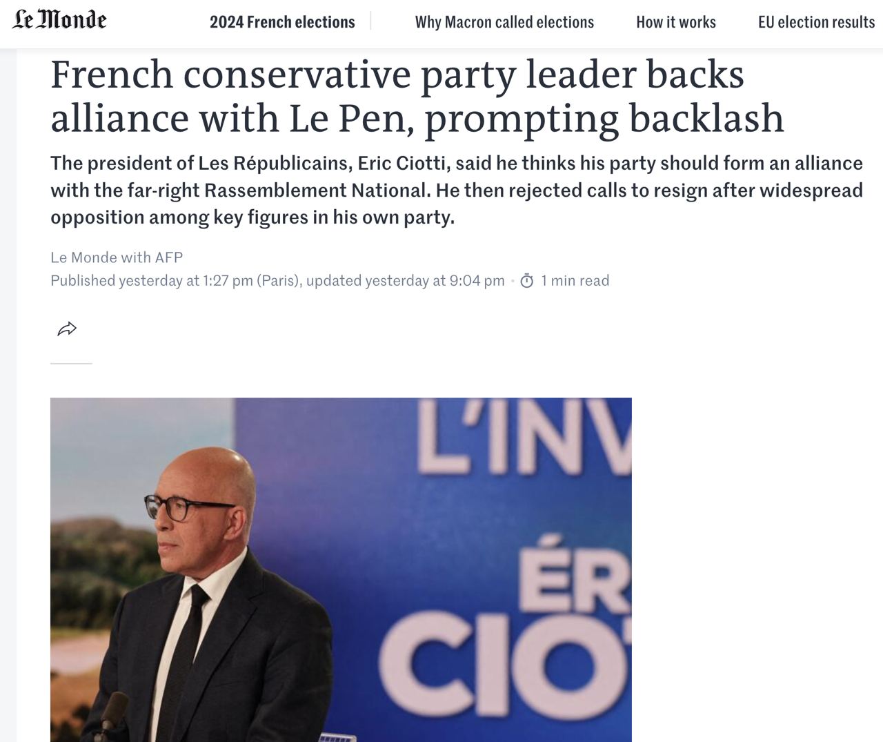 Слухи о том, что "Республиканцы" пойдут на выборы в союзе с RN, в политических кругах Франции ходят уже несколько дней. Если это произойдет, то это резко повысит шансы на победу партии Ле Пен с учетом двухтуровой системы выборов во французский парламент, когда во второй тур выходят два кандидата, получившие наибольшее число голосов, при условии, что ни один из них не взял более 50% в первом туре.