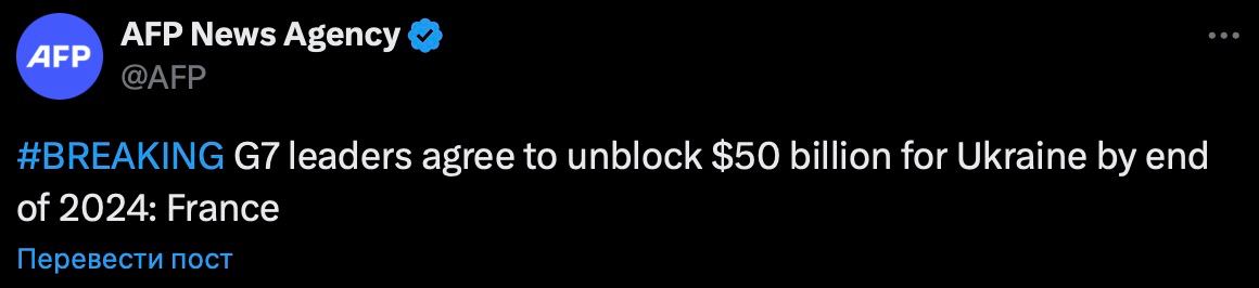 Информацию AFP о договоренности стран "Большой семерки" о кредите Украине на 50 млрд долларов за счет процентов с замороженных российских активов проанализировал телеграм-канал "Политика Страны".