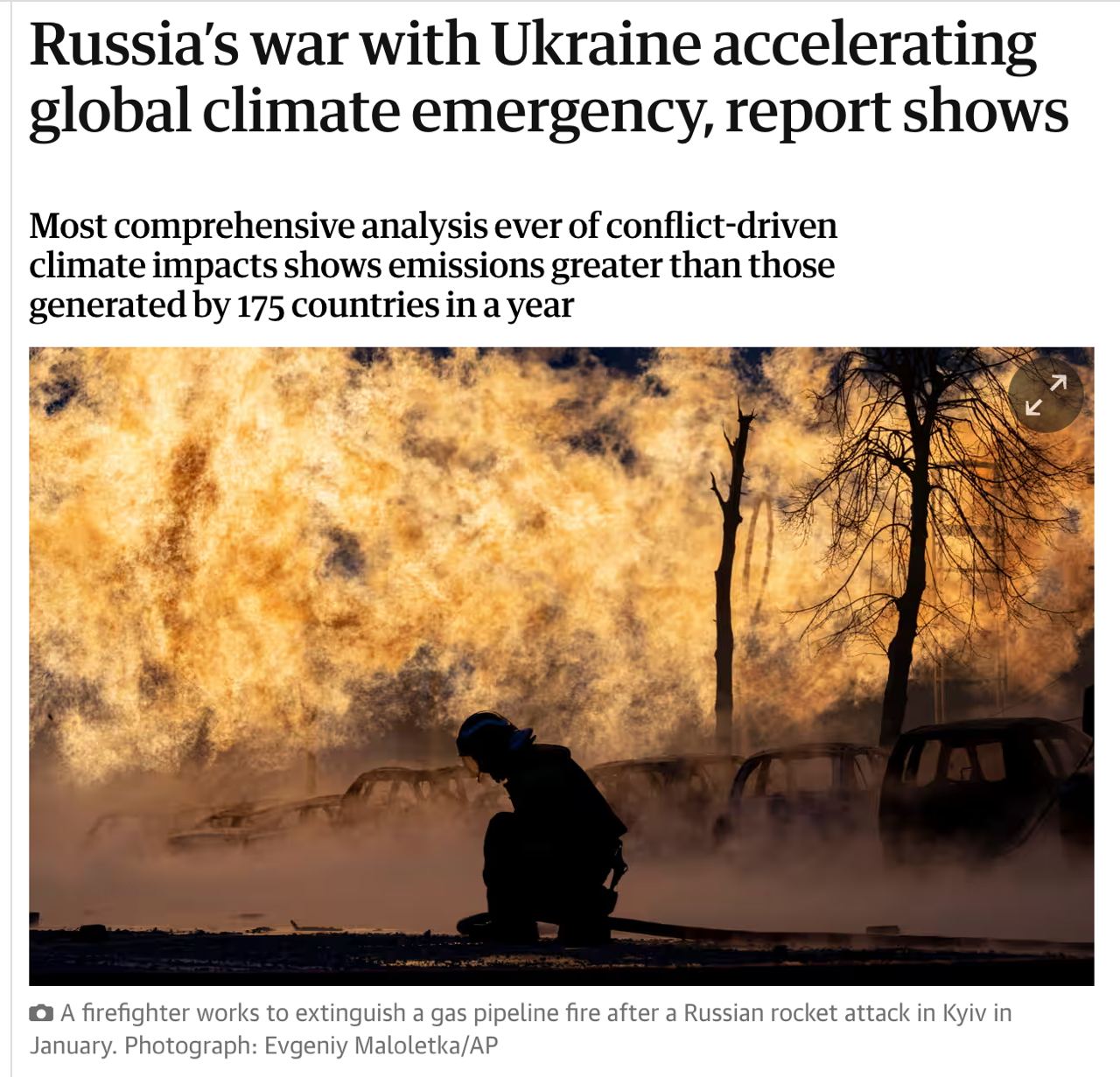 "Климатические издержки первых двух лет войны России с Украиной превысили ежегодные выбросы парниковых газов, производимые 175 странами по отдельности, что усугубило глобальную климатическую чрезвычайную ситуацию", - пишет издание.