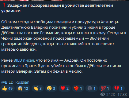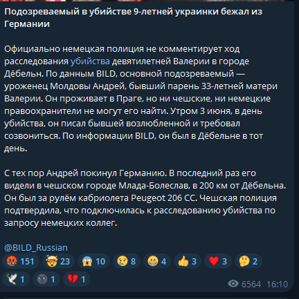 Главный подозреваемый в убийстве 9-летней украинки Валерии в немецком Дёбельне сбежал из Германии. Уроженец Молдовы Андрей, который встречался с матерью убитой, проживает в Праге. Ни чешские, ни немецкие правоохранители не могли его найти, однако в итоге задержали в Чехии.