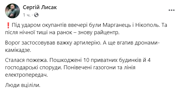 "Под ударом оккупантов вечером были Марганец и Никополь. И после ночной тишины на утро – снова райцентр", - говорится в сообщении.