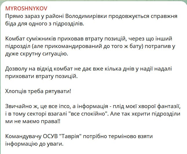 «Прямо сейчас в районе Владимировки продолжается беда для одного из подразделений. Комбат смежников скрыл потерю позиций, из-за чего другое подразделение (но прикомандированное к тому же бату) попало в очень затруднительную ситуацию. Разрешения на уход комбат не дает уже несколько дней в надежде в дальнейшем скрыть потерю позиций. Ребят надо спасать», – написал он.