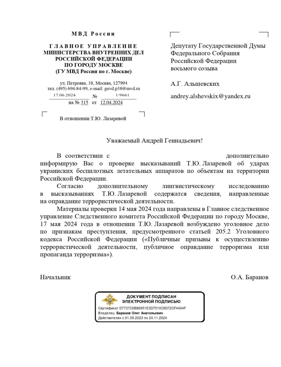 "Материалы проверки направлены в Главное следственное управление Следственного комитета РФ по Москве. 17 мая 2024 года в отношении Т.Ю. Лазаревой возбуждено уголовное дело по признакам преступления, предусмотренного статье 205.2 Уголовного кодекса РФ ("Публичные призывы к осуществлению террористической деятельности, публичное оправдание терроризма и пропаганда терроризма"), — говорится в документе.