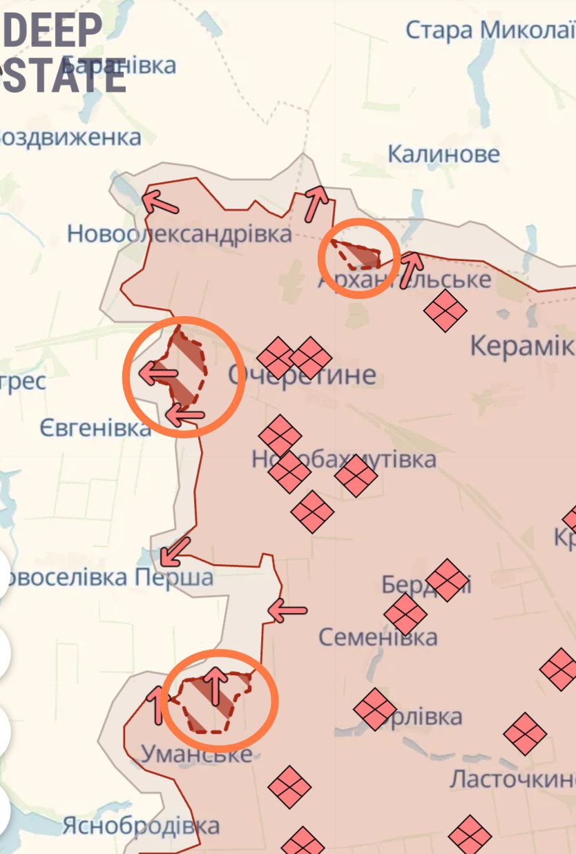 Российские войска продвинулись в трёх местах на Покровском направлении. Как сообщает паблик Deep State, продвижение было в районе Архангельского, Сокола и Уманского.
