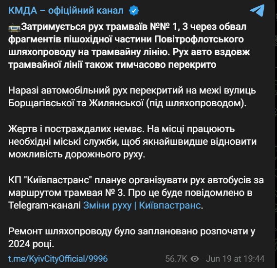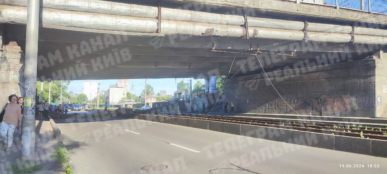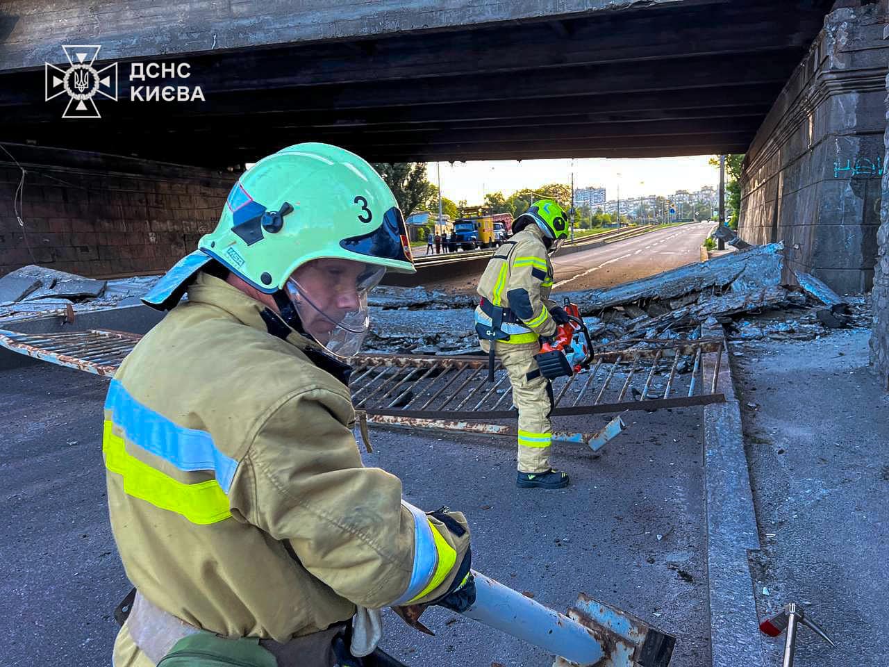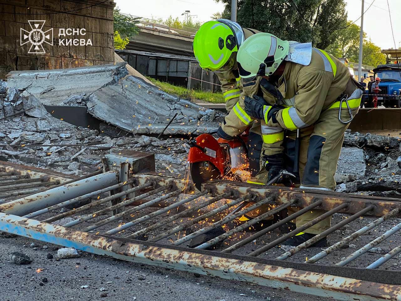В ГСЧС Киева сообщили, что спасатели разрезают металлические конструкции с помощью гидро- и электроинструмента. Также производится расчистка дороги от разрушенных конструкций.