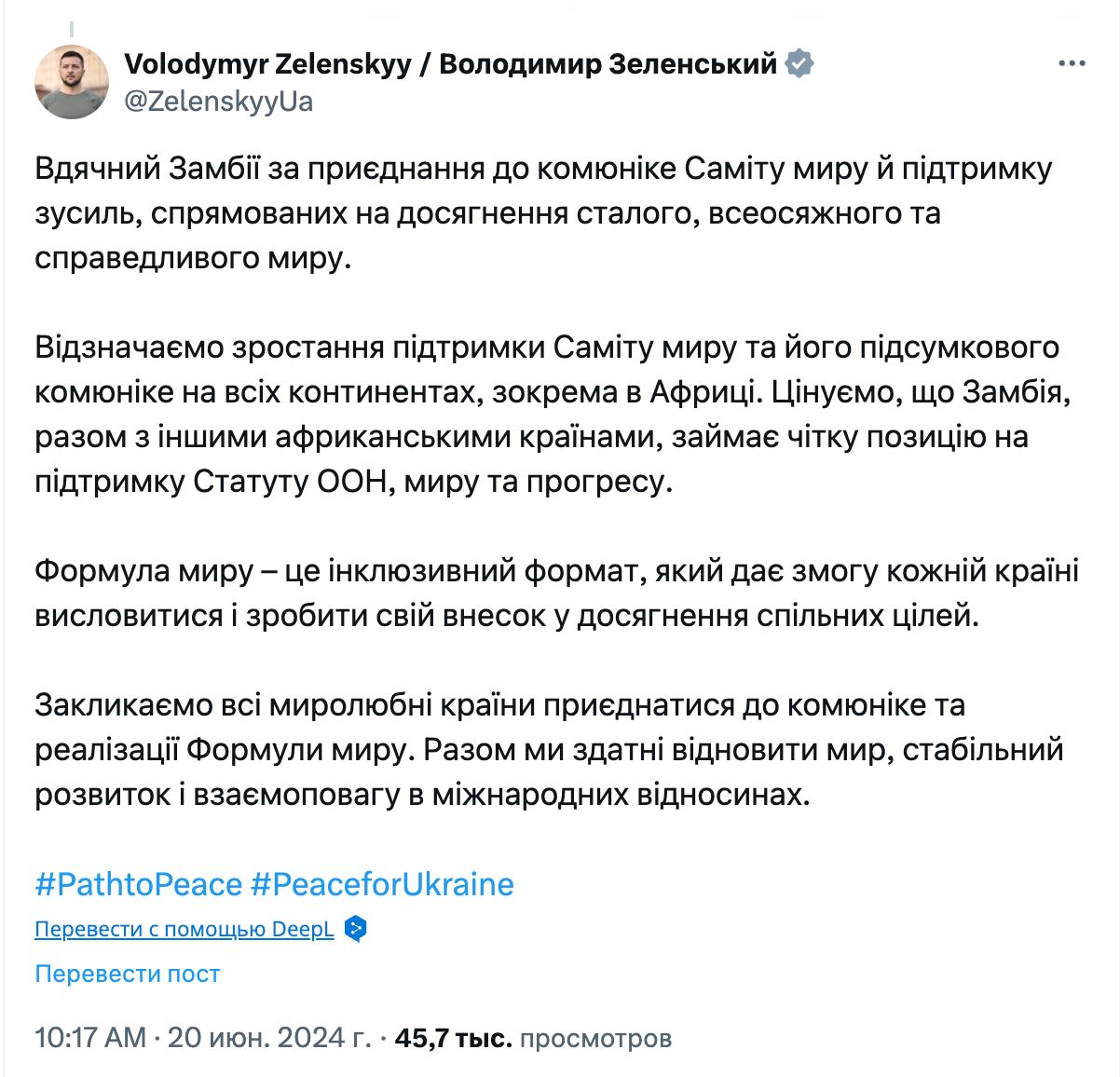 11:36 Замбия присоединилась к швейцарской мирной декларации, сообщает президент Украины Владимир Зеленский.
