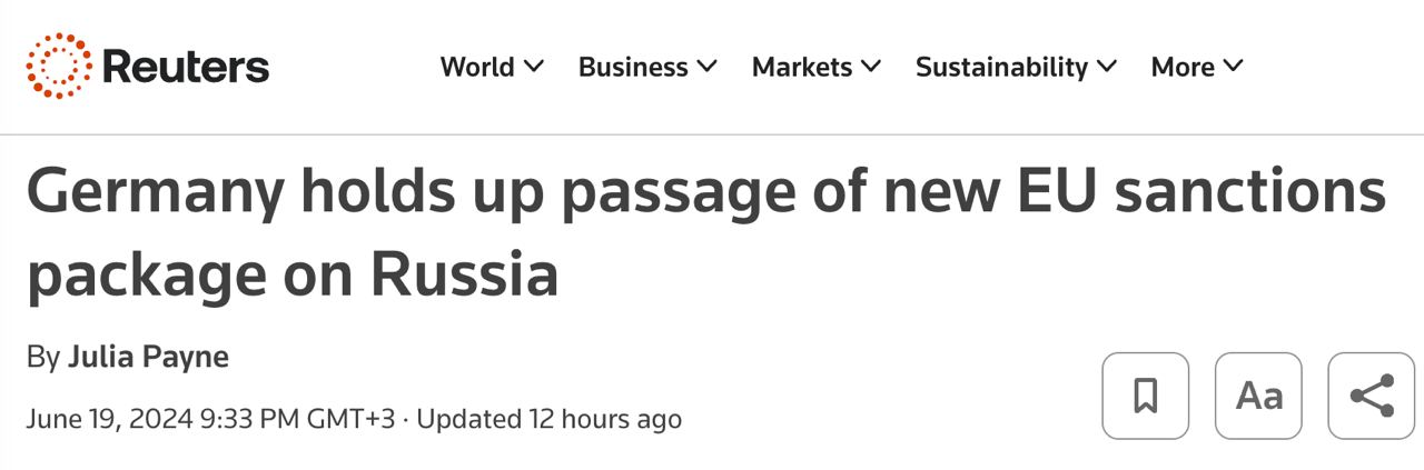 Однако в среду Германию снова заблокировала принятие нового пакета санкций, который обсуждают уже больше месяца. По какой причине, Reuters не уточняет.
