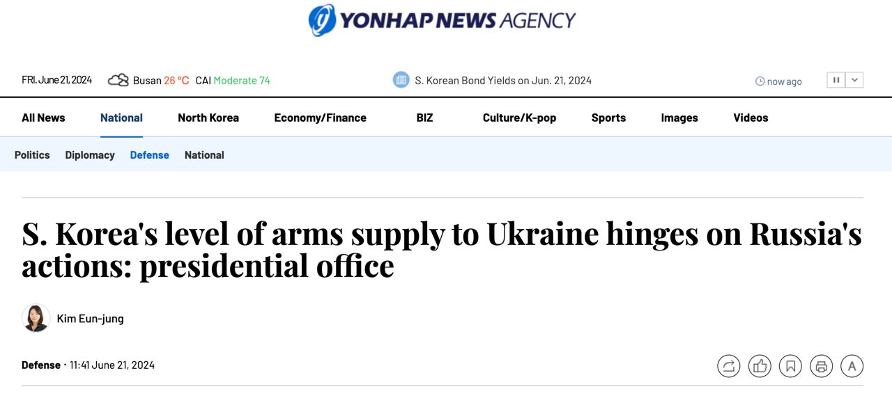 По данным южнокорейского агентства, в администрации президента Юн Сок Ёля пока изучают возможность поставок.