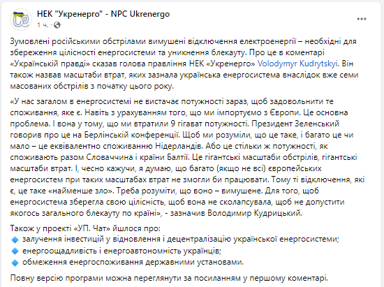 "Это гигантские масштабы обстрелов, гигантские масштабы потерь. Поэтому те отключения, которые есть, это такое "наименьшее зло", - добавил Кудрицкий.