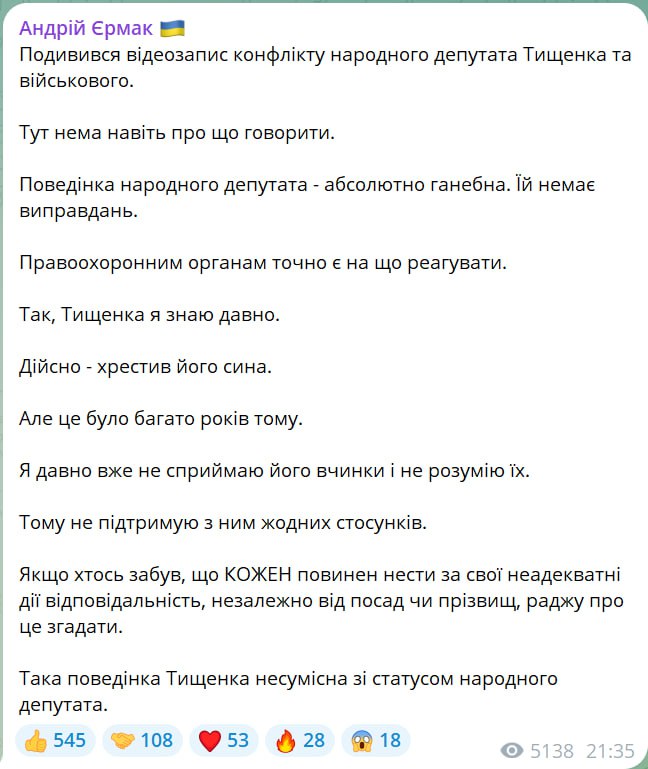 "Здесь не о чем даже говорить. Поведение народного депутата совершенно позорное. Ему нет оправданий. Правоохранительным органам точно есть, на что реагировать… Такое поведение Тищенко несовместимо со статусом народного депутата", – написал Ермак.