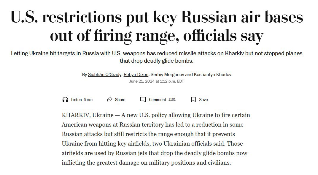 Украинские чиновники также признали, что решение Байдена не защитило украинские позиции от планирующих авиабомб, которые Россия сбрасывает из своего воздушного пространства.