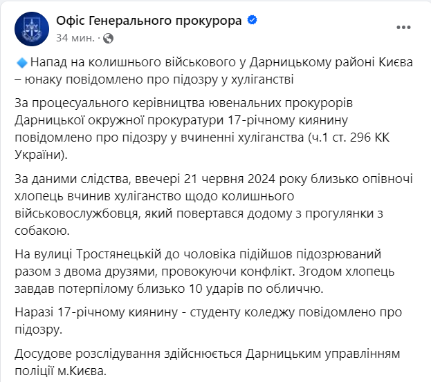 Правоохранители сообщили о подозрении в хулиганстве подростку, избившему бывшего военного 32 ОМБр Александра в Киеве вечером 21 июня.