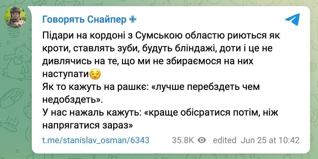 "Роются как кроты, ставят зубы, строят блиндажи, ДОТы и это несмотря на то, что мы не собираемся на них наступать. Как говорится на рашке: "лучше перебздеть чем недобздеть". У нас к сожалению говорят: "лучше обо@раться потом, чем напрягаться сейчас", - пишет "Осман".