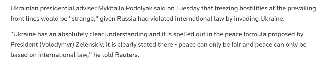"У Украины есть абсолютно четкое понимание, и оно прописано в формуле мира, предложенной президентом Зеленским, там четко сказано - мир может быть только справедливым и мир может быть основан только на международном праве", - сказал Подоляк.